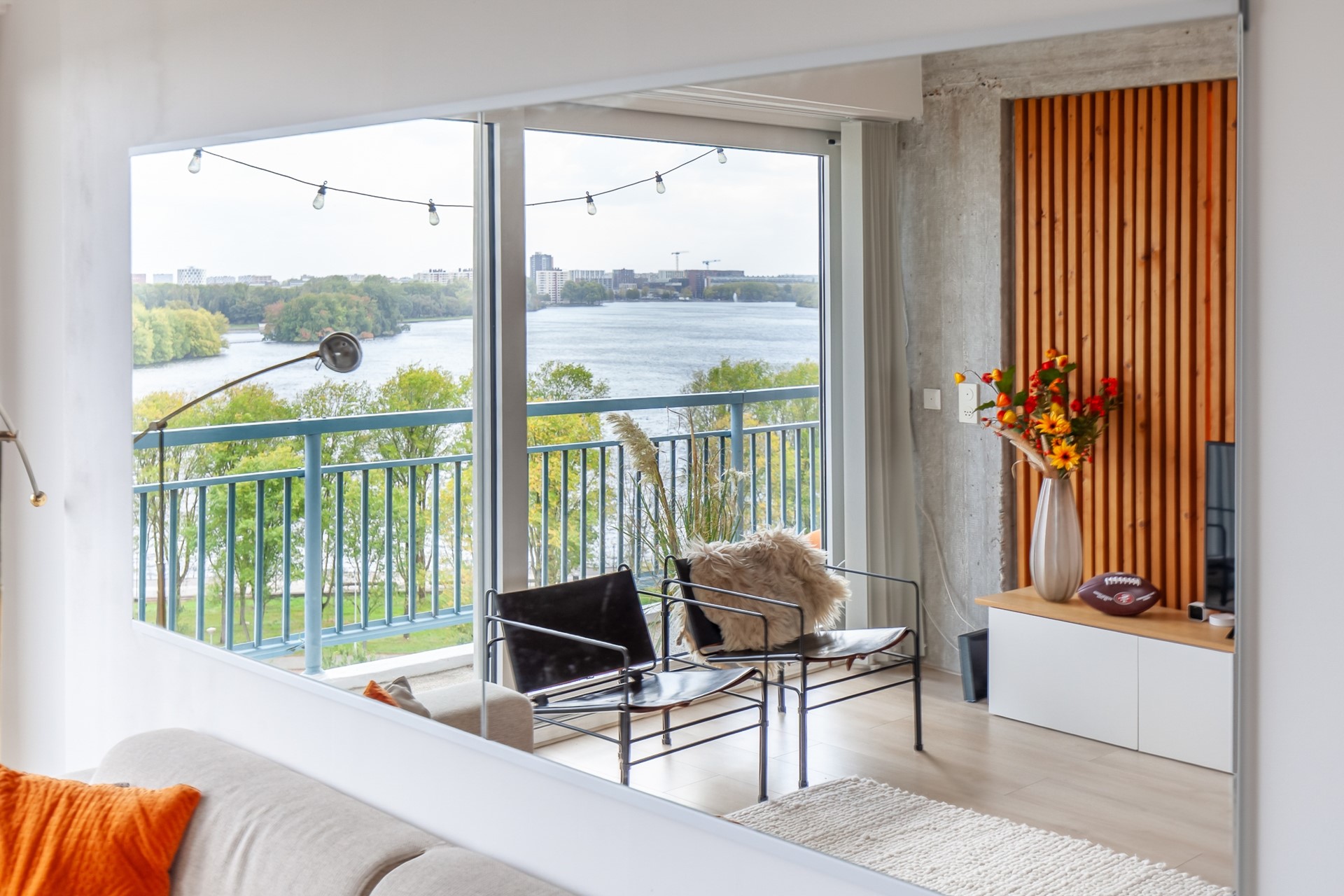 The generous 12 m² west-facing balcony enjoys sunshine throughout the afternoon and evening, offering spectacular views over the Sloterplas, the perfect spot to relax and enjoy the sunset.