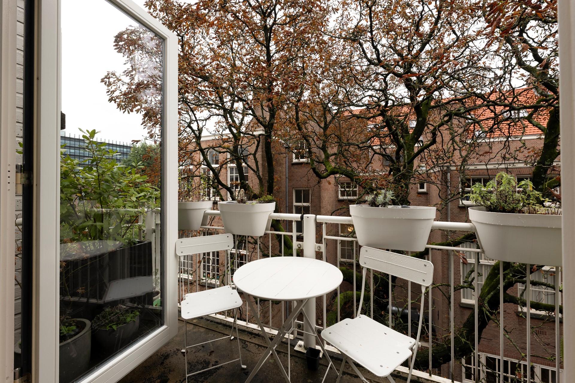 Adjoining the kitchen is a south-facing balcony, perfect for enjoying the morning and early afternoon sun in a peaceful setting, overlooking the green inner courtyard (Stadstuin) of the residences.