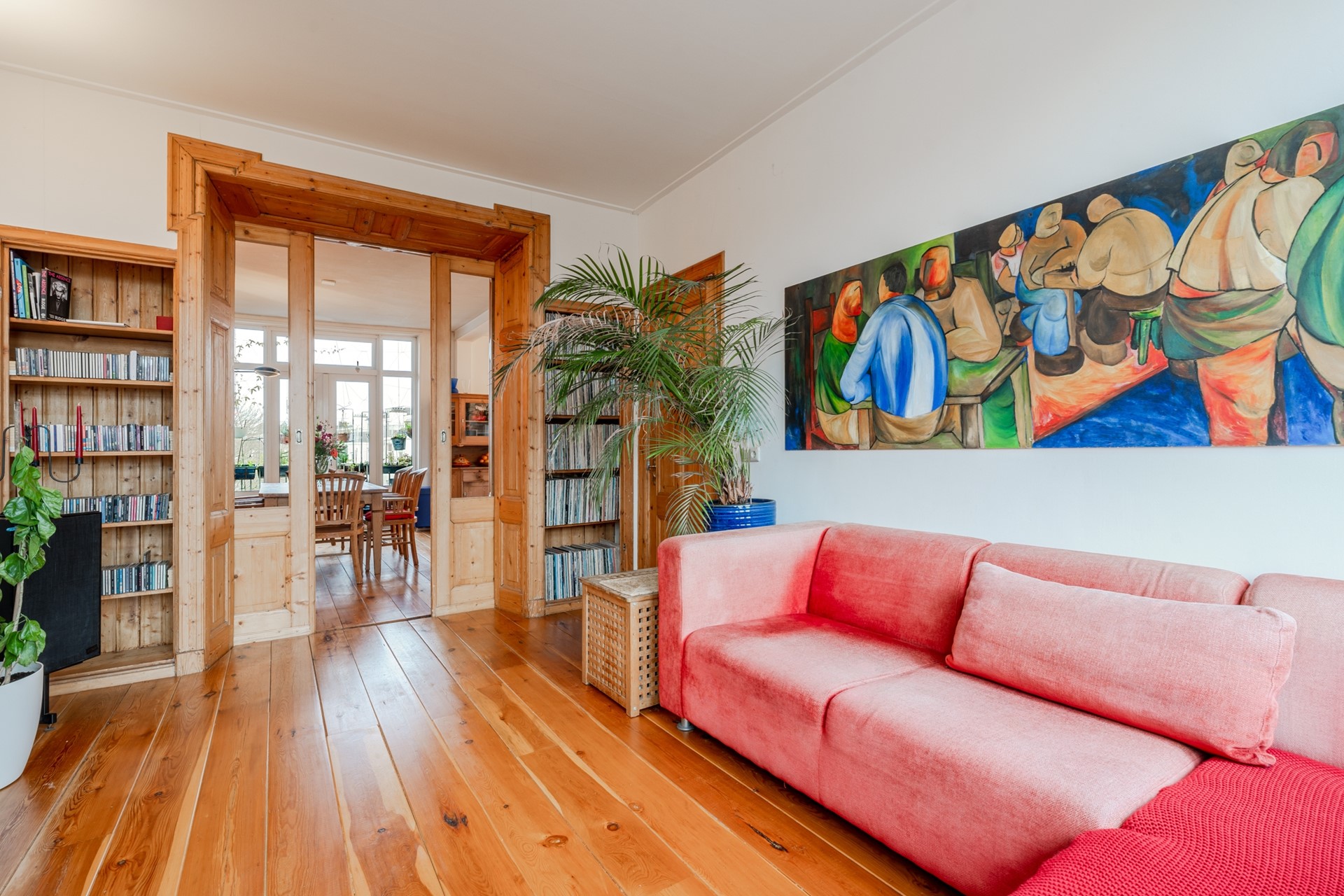 De woonkamer heeft door de originele en suite een aparte eetkamer achter en een woonkamer aan de voorzijde. Hier is de originele marmeren schouw bewaard gebleven. De royale woonkeuken aan de achterzijde grenst aan het balkon. Door een groot gedeelte van het appartement ligt een houten vloer van Siberisch grenen. Alle ramen hebben dubbel glas, waardoor het heerlijk stil is in de woning zelf.