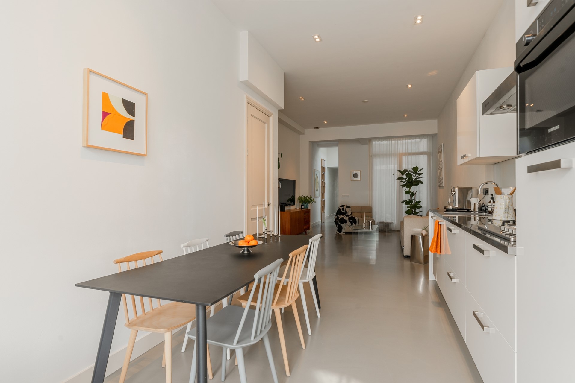 De ruime woonkamer ligt in het midden van de woning. Vanaf hier krijg je veel licht vanuit de patio midden in het appartement. In de gehele woning ligt een lichtgrijze gietvloer met vloerverwarming.