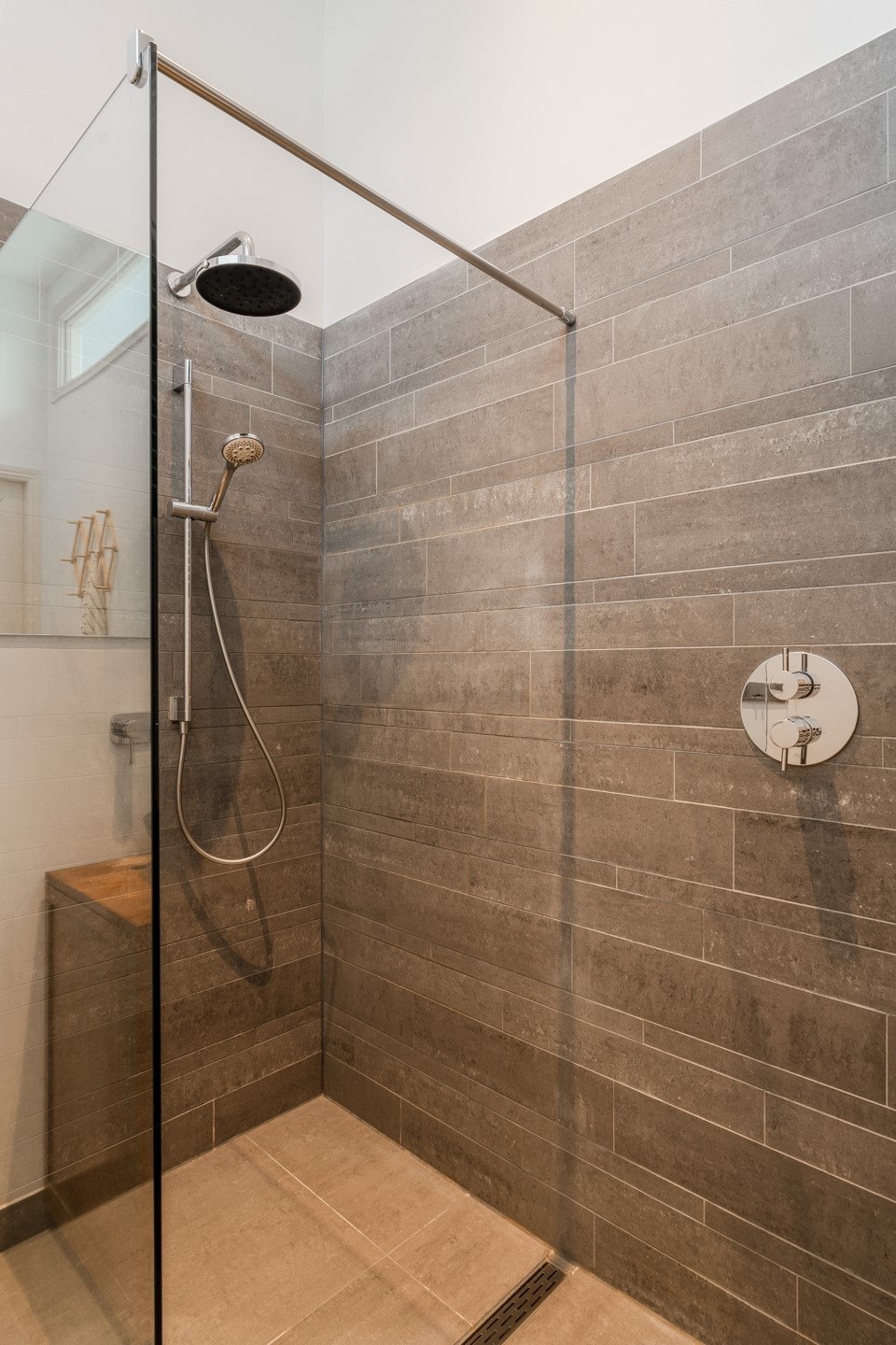De badkamer ligt tussen de twee slaapkamers. Er is een ruime inloopdouche, een wastafelmeubel met verwarmde spiegel dat niet beslaat en een handdoek radiator. Naast de badkamer is het separaat toilet met fontein en in de gang bevindt zich het washok met aansluitingen voor de wasmachine en droger.