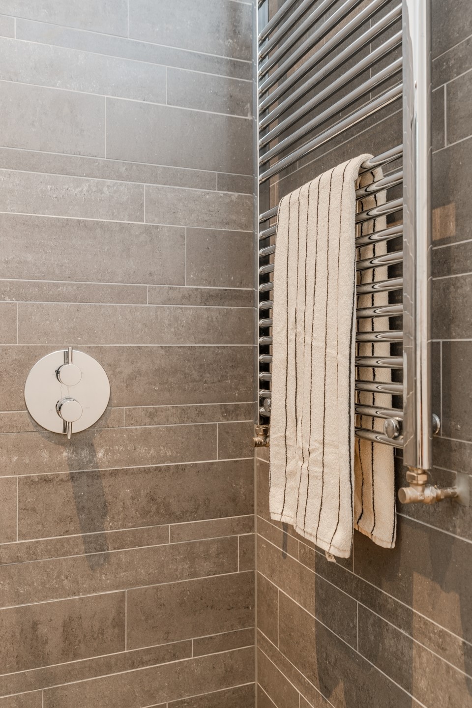 The bathroom is located between the two bedrooms. There is a spacious walk-in shower, a vanity unit with a heated mirror that does not fog up, and a towel radiator. Next to the bathroom is the separate toilet with a small sink, and in the hallway there is the laundry room with connections for the washing machine and dryer.