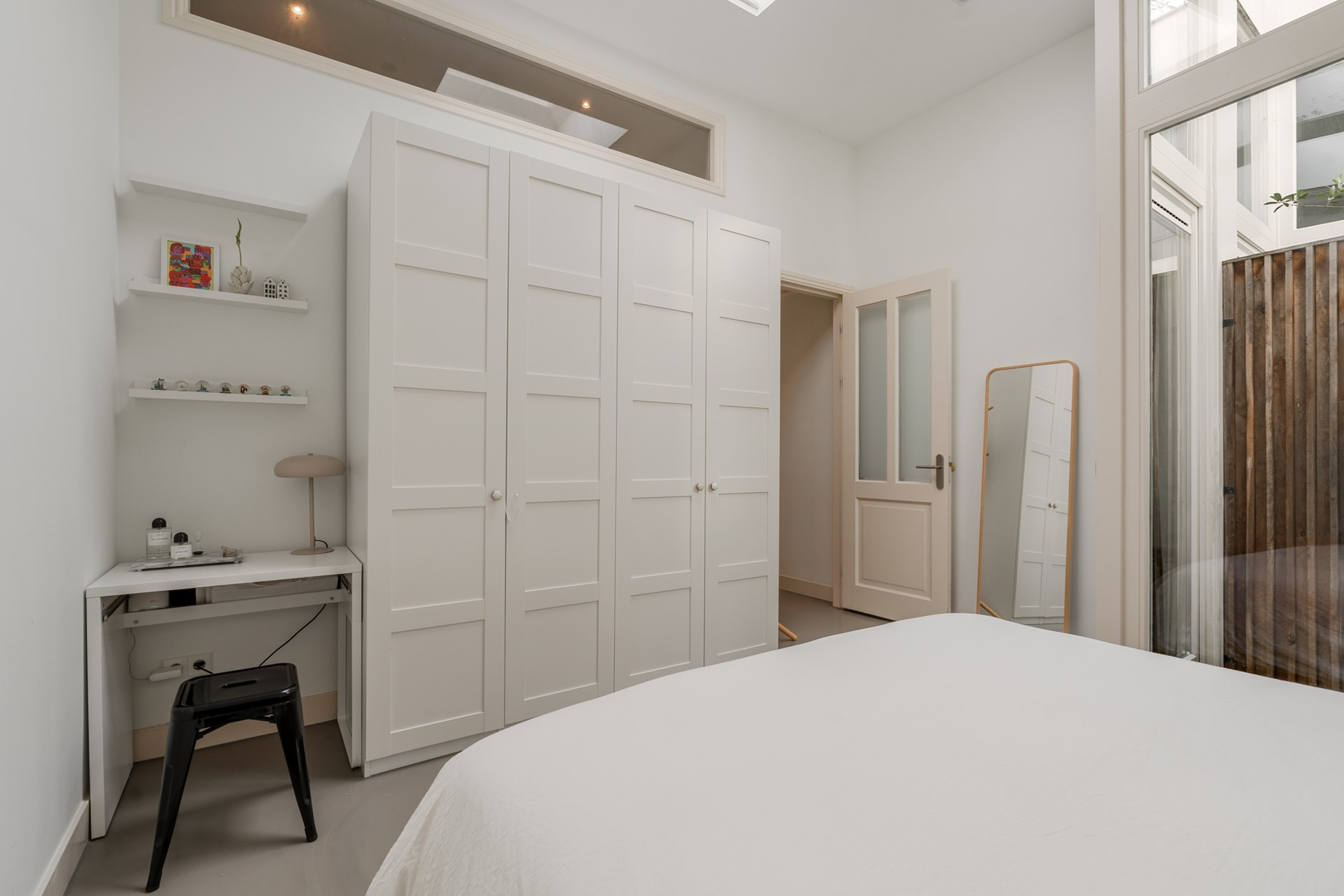 The master bedroom is located at the quiet rear side with a compact outdoor space, allowing plenty of light to enter. There is enough space for a double bed and a large wardrobe. The second bedroom is located at the patio. Optimal peace and quiet: above the bedrooms there are no upstairs neighbors, only the private flat roof.