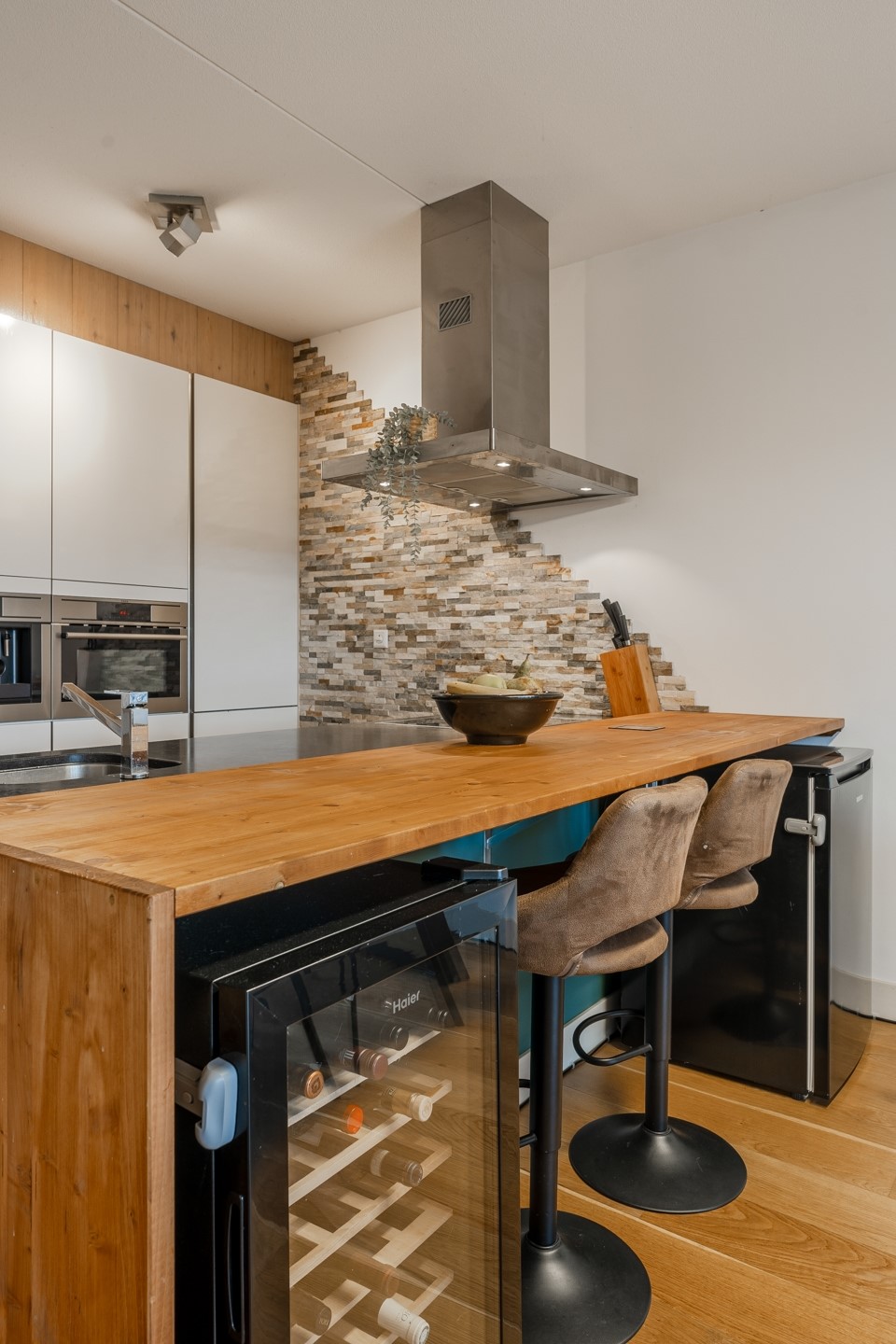 De moderne keuken met gezellige bar heeft veel kastruimte en alle moderne inbouwapparatuur is aanwezig. Er is een koelkast, vriezer, vaatwasmachine, combi-oven/ magnetron en grote oven, afzuigkap, inductiekookplaat en ingebouwde koffiemachine. Naast de keuken is een inpandige berging met veel ruimte voor voorraad en de wasmachine en droger opstelling.