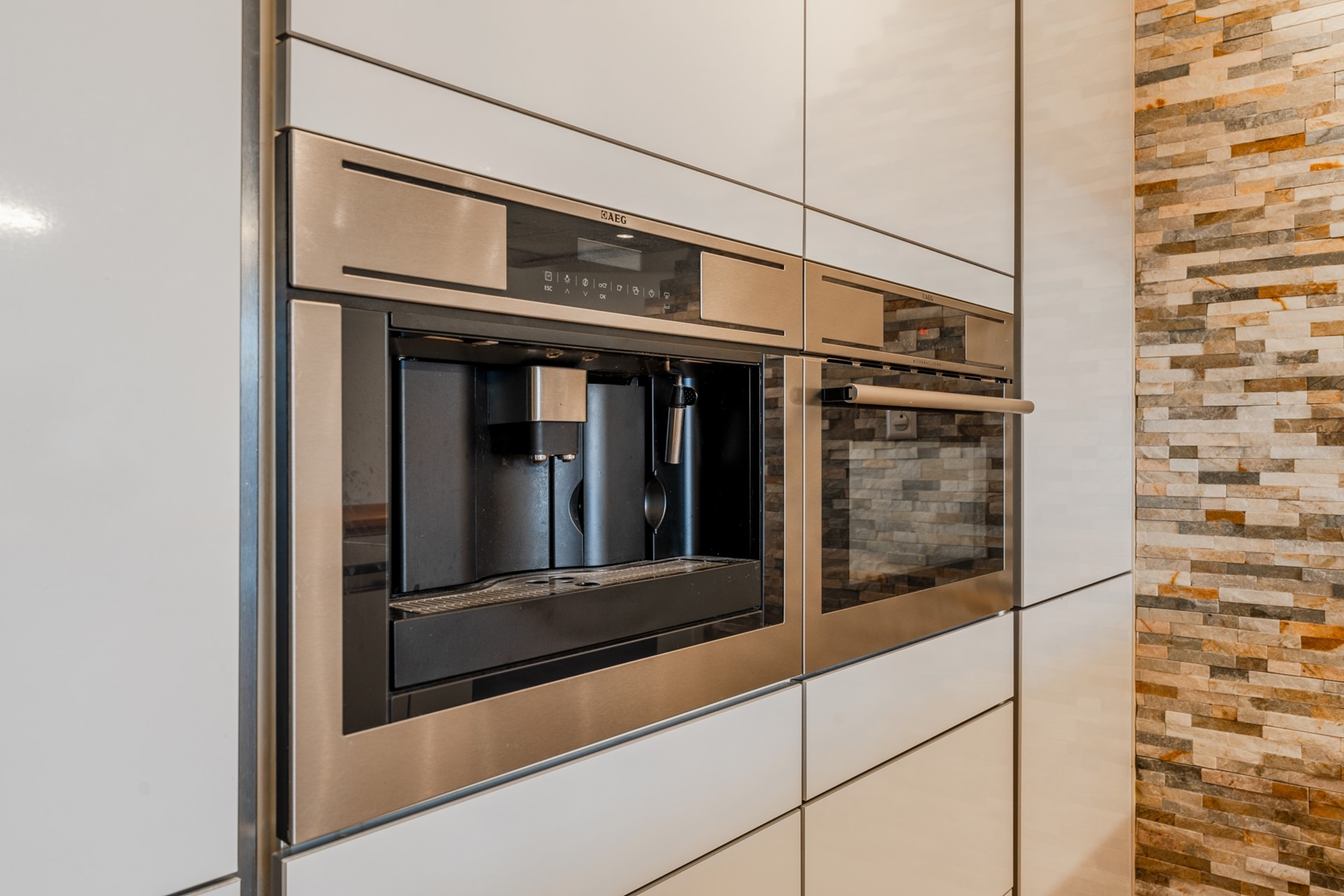The modern kitchen with a cosy bar has plenty of cupboard space and all modern built-in appliances are present. There is a refrigerator, freezer, dishwasher, combination oven and microwave and big oven, extractor hood, induction cooktop and built-in coffee machine. Next to the kitchen is an internal storage room with plenty of space for supplies and the washing machine and dryer setup.