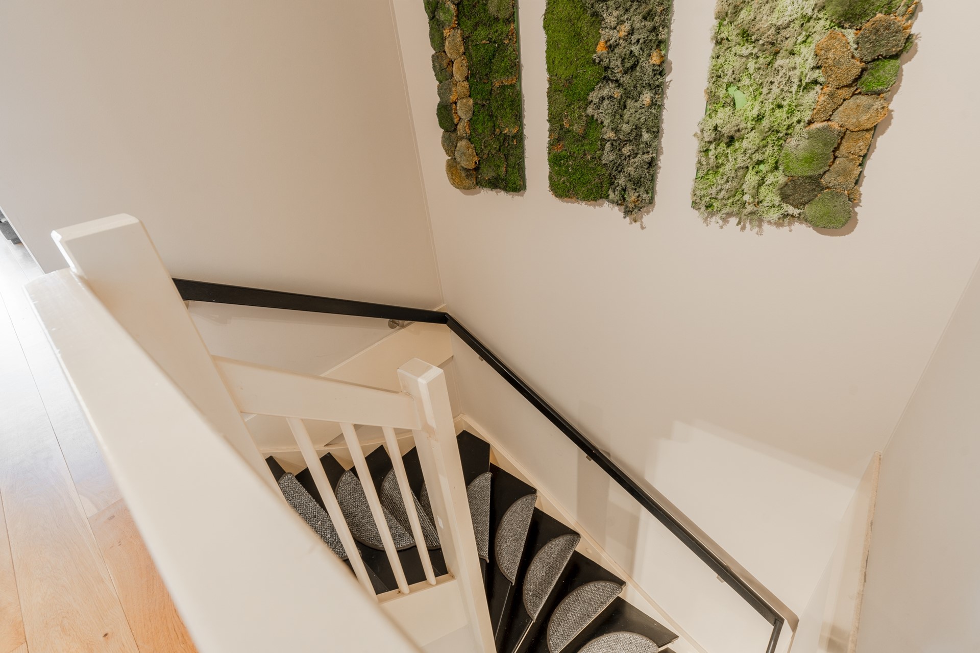 Op de vierde verdieping is de entree van het appartement zelf. In je eigen hal de trap naar de woonkamer en de hoofdslaapkamer en de badkamer en royale garderobekast.