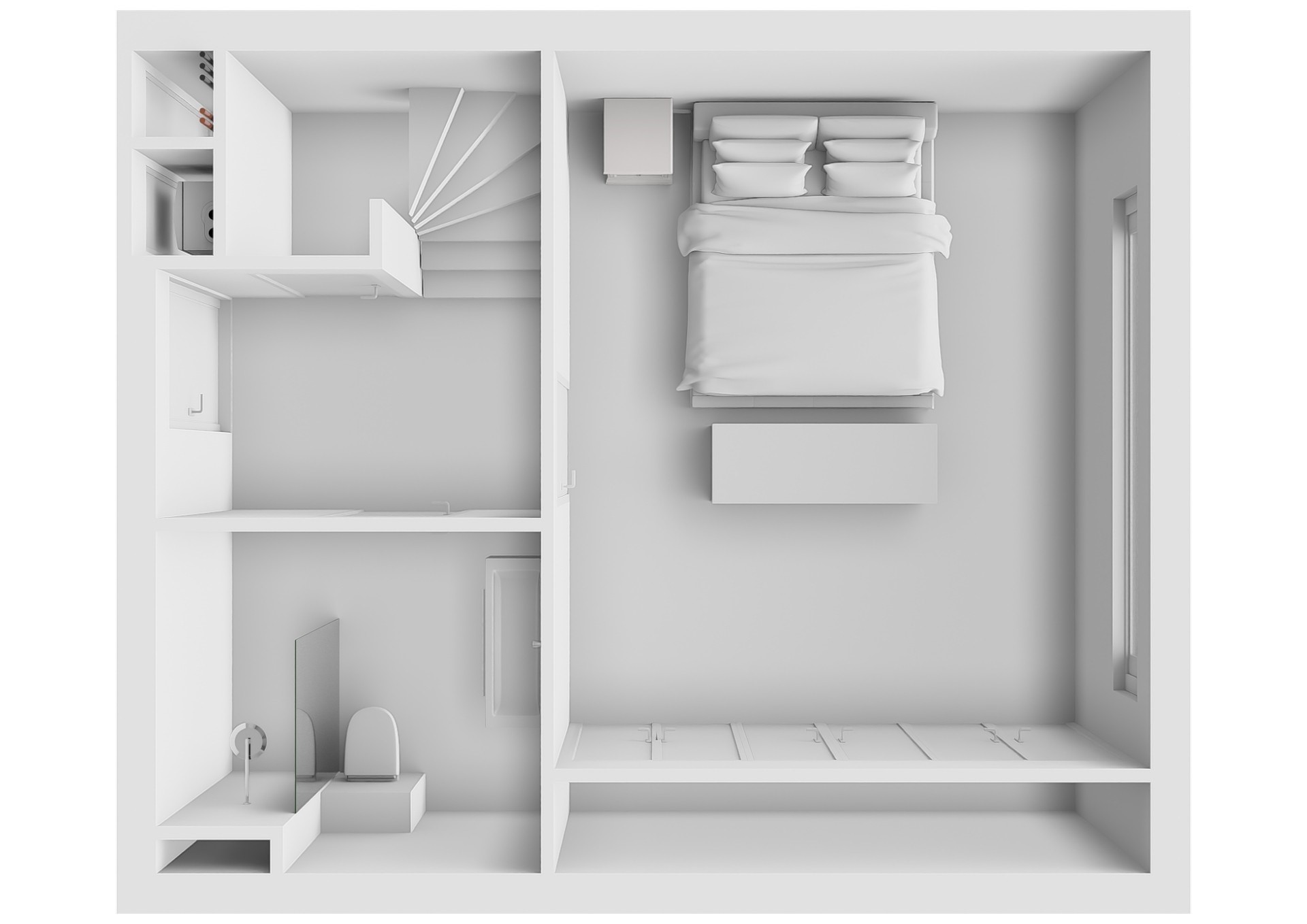On the fourth floor is the entrance to the apartment itself. In your own hallway are the stairs to the living room and the master bedroom, as well as the bathroom and a spacious wardrobe closet.
