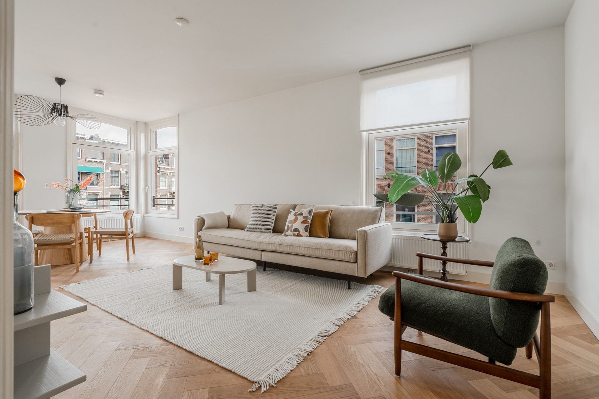 The living room is spacious and wonderfully bright thanks to the many windows all around. The inviting bay window offers a beautiful view of Overtoom. The living room is mainly located on the quiet Frederikstraat. The wooden window frames have been recently painted and have HR++ glass. The entire apartment has beautiful oak herringbone flooring