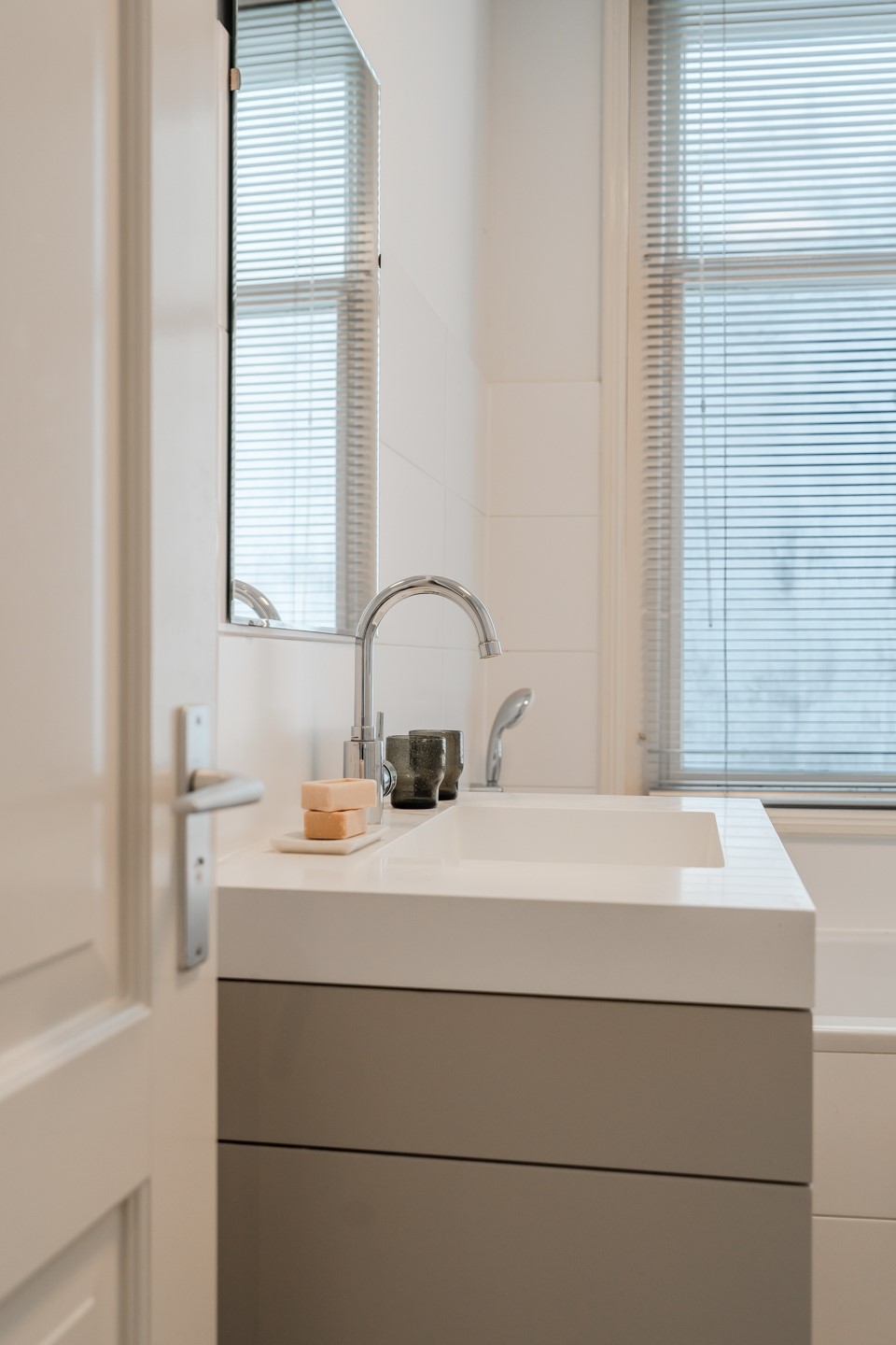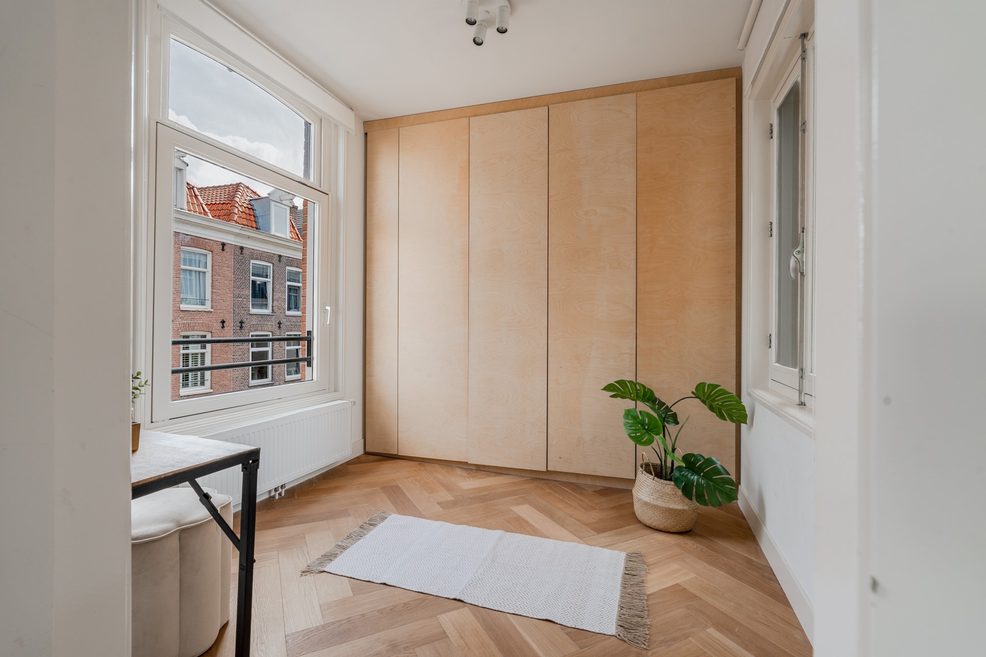 Both bedrooms are located on the quiet Frederiksstraat. The main bedroom has plenty of room for a king-size bed and a wardrobe. The second bedroom is slightly smaller, but thanks to the windows on both sides there’s a lot of natural light.