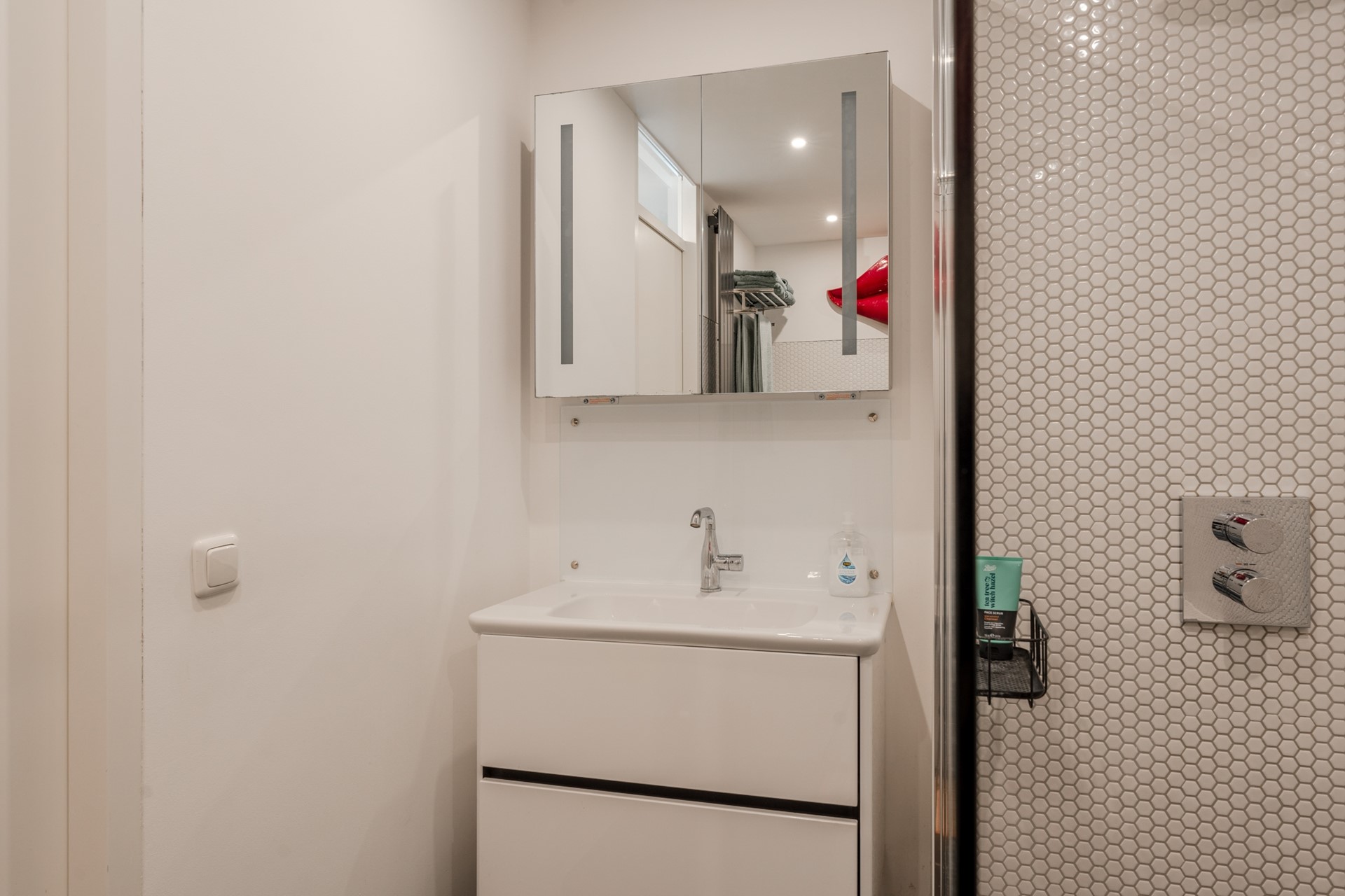 The modern white bathroom is spacious and features a bathtub, walk-in shower, designer radiator, and vanity. Adjacent to the bathroom is the toilet with a small sink.