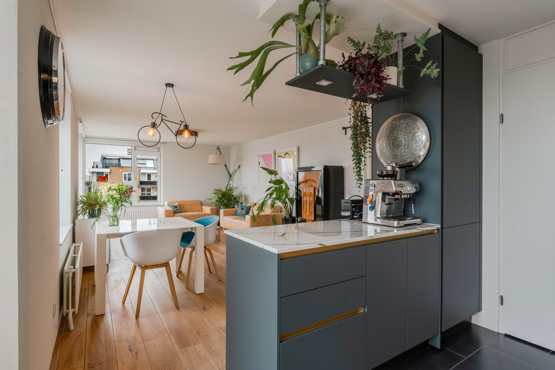 De ruime woonkamer is heerlijk licht. In de woonkamer ligt een goed onderhouden houten parketvloer en in de keuken liggen zwarte tegels. De halfopen keuken is in 2022 vernieuwd. De groene keuken heeft een wit marmeren werkblad met groene en zwarte accenten en is voorzien van diverse inbouwapparatuur. De combi oven en vaatwasser zijn van het A-merk Siemens. Verder is er een inductie kookplaat met integraal afzuiging van Bora. Achter de keuken is de interne berging met aansluitingen voor wasmachine en droger.