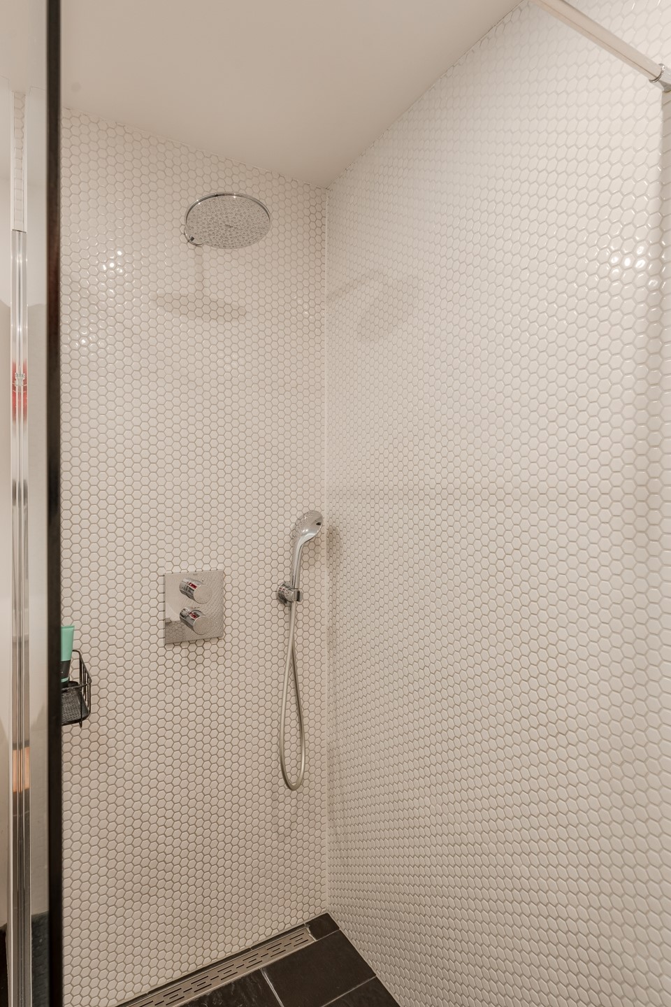 De moderne witte badkamer is lekker ruim met een ligbad, inloopdouche, designradiator en een wastafelmeubel. Naast de badkamer bevindt zich het toilet met fonteintje.