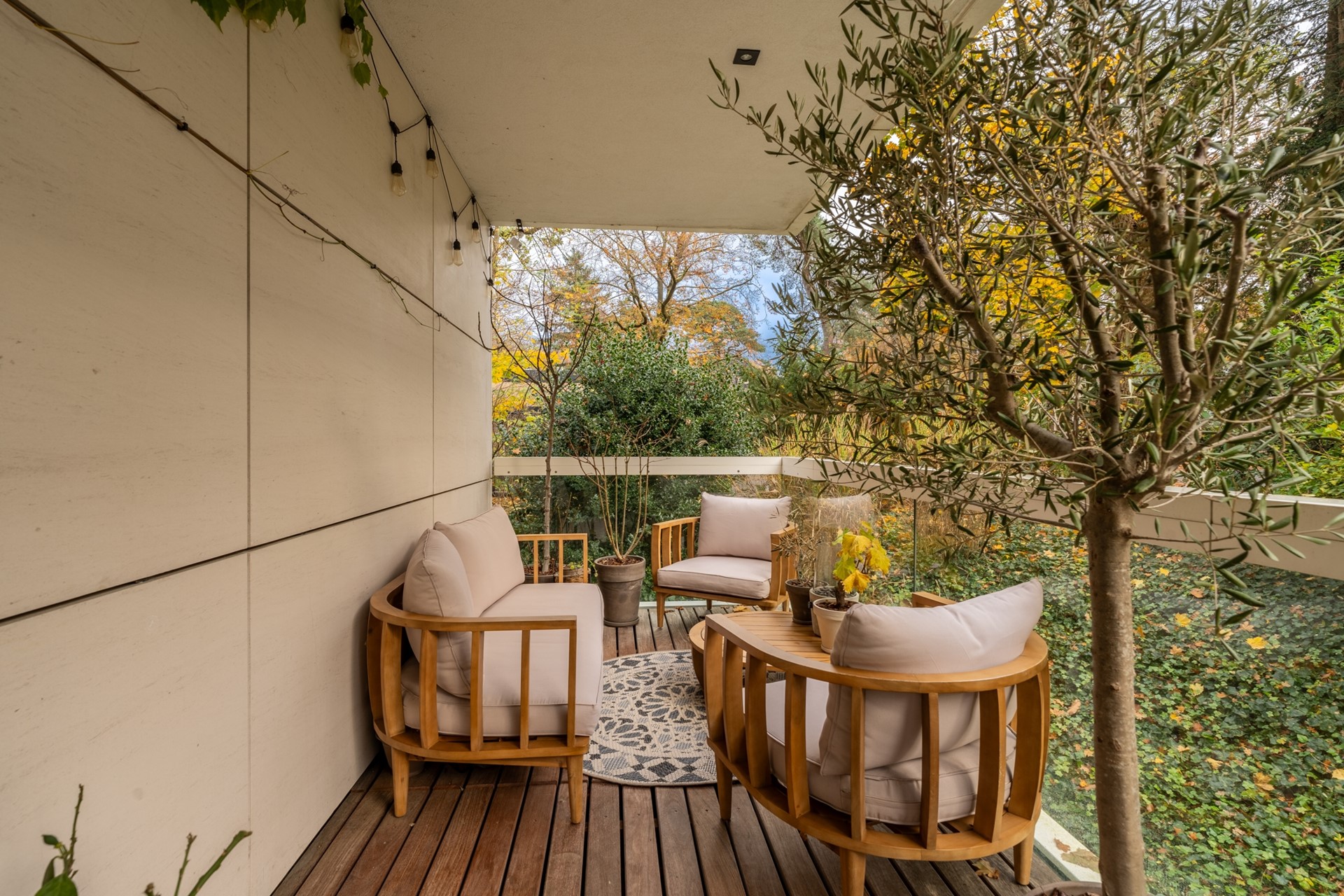 Upon entering, the bright and spacious living room immediately catches your eye, surrounded by windows and opening onto a sunny terrace overlooking the quiet, wooded garden. The room features a custom-built TV wall with Dimplex fireplace, decorative wooden wall panels, and bronze-tinted mirrors for added warmth and elegance. The flooring throughout the home is Swiss Bauwerk Parquet.