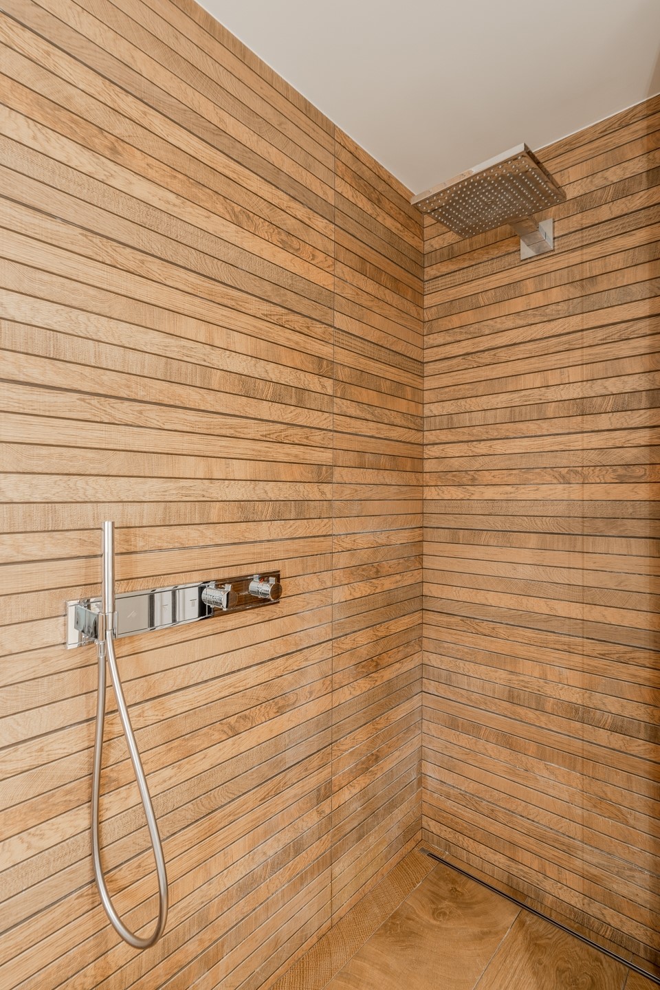 The bathroom has a spacious walk-in shower, a freestanding BDutch bathtub, custom-built vanity unit, towel radiator, and the second toilet. Stylish Porcelanosa tiles are combined with microcement walls.