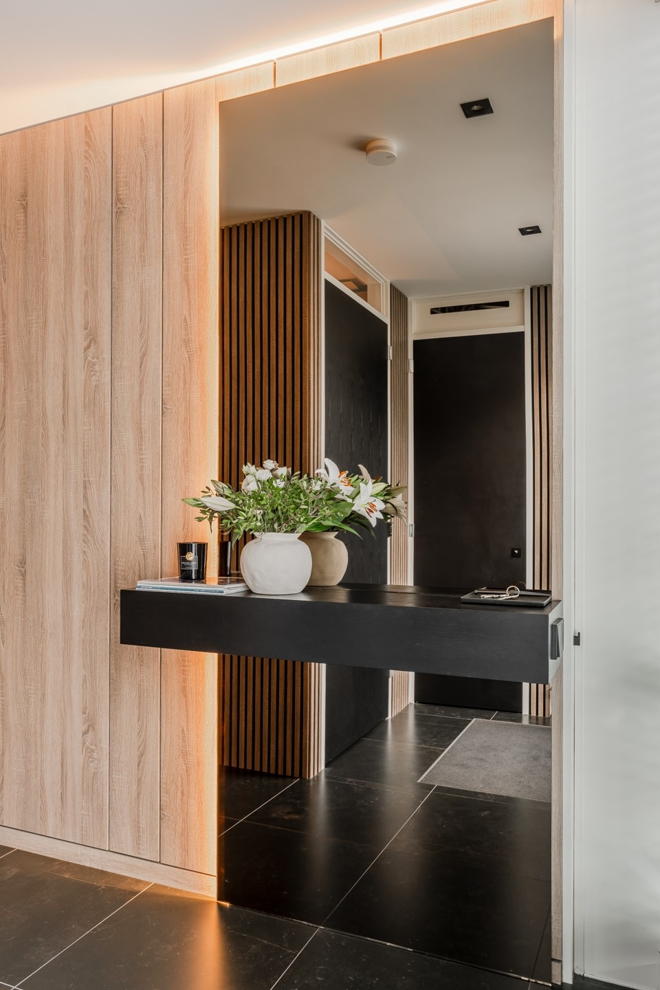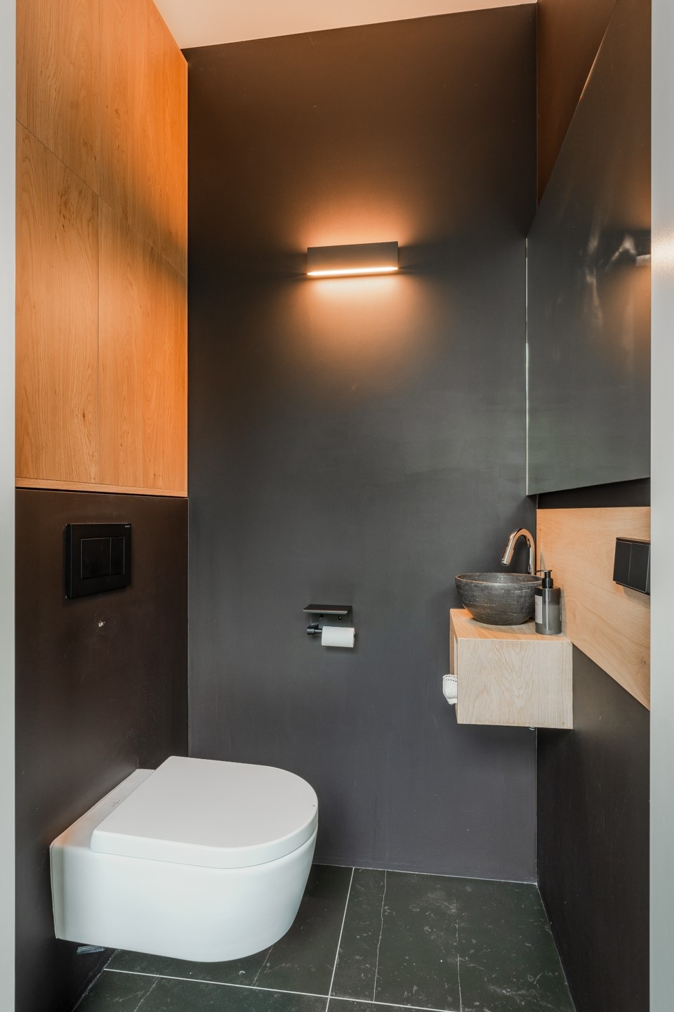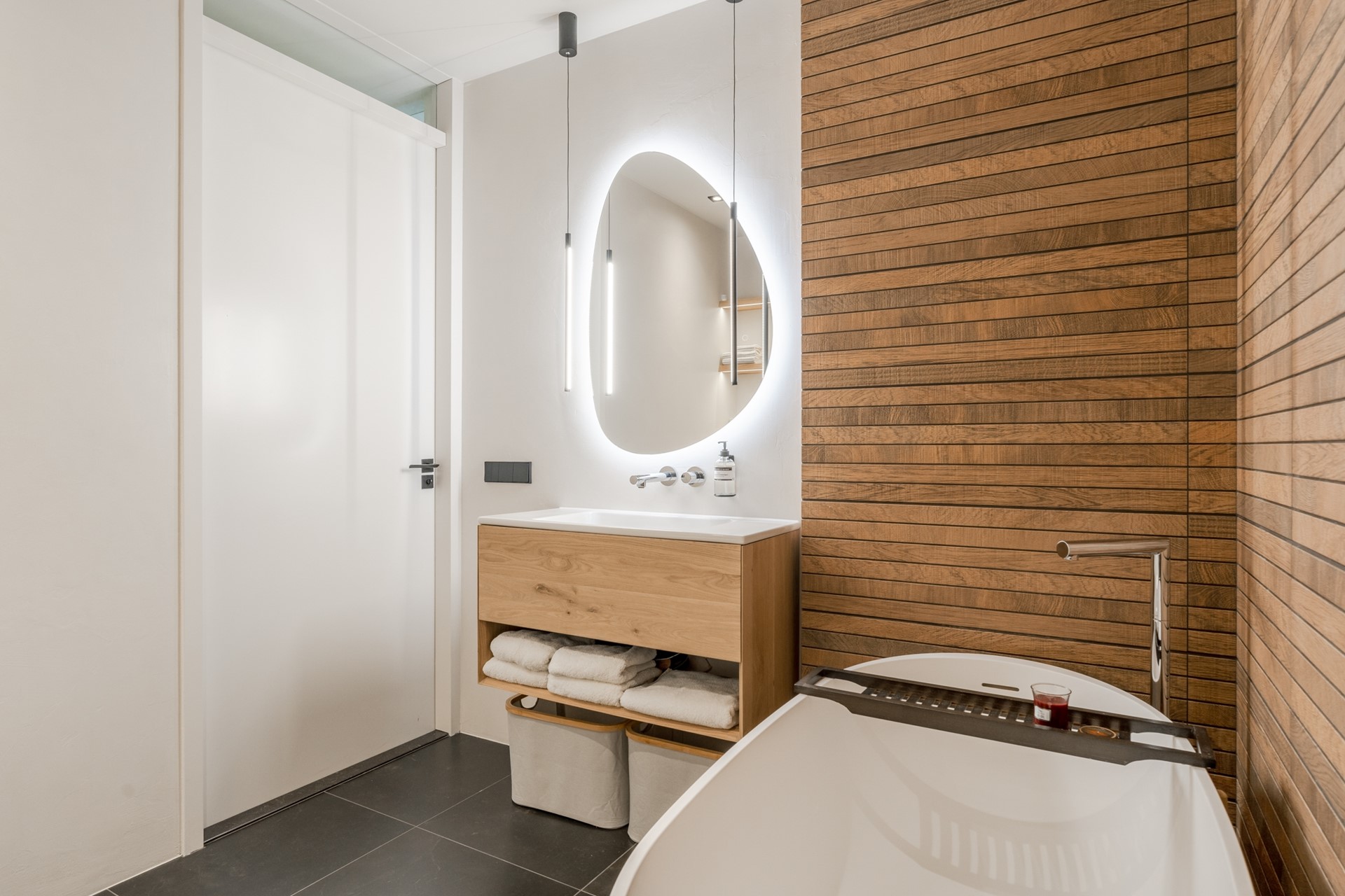 De badkamer heeft een ruime inloopdouche, een vrijstaand ligbad van B Dutch, maatwerk wastafelmeubel, een handdoekradiator en het tweede toilet. Een Porcelanosa-tegel is stijlvol gecombineerd met Microcement wanden.